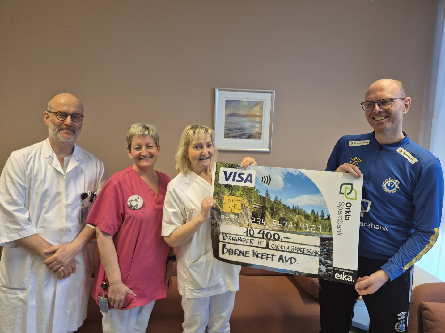 Atle Olav Sognli besøkte seksjon Barn kreft- og blodsykdommer ved St. Olav for å overrekke sjekken fra kronekampen.